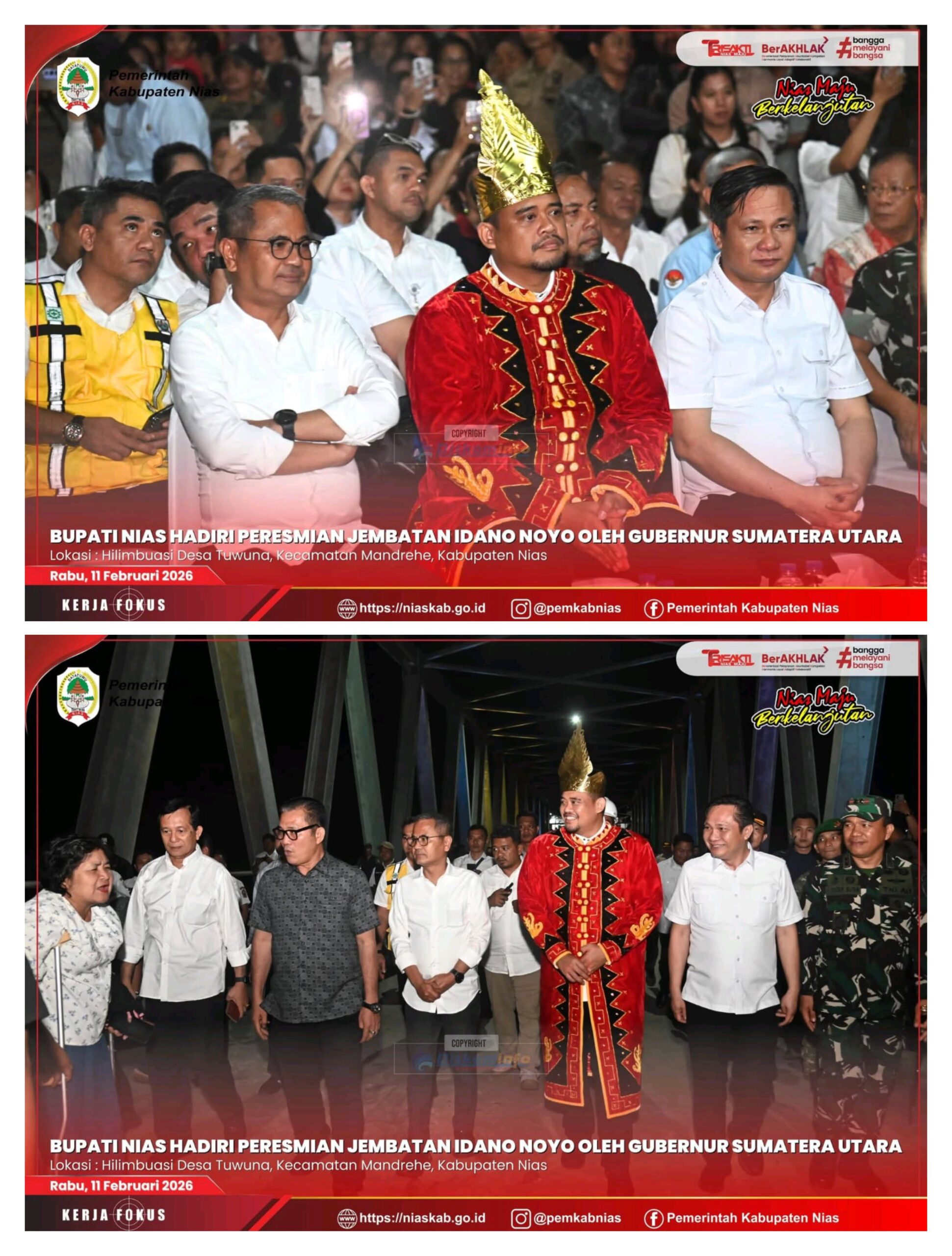 - HAKSUARA.CO.ID / Nias / — Bupati Kabupaten Nias Yaatulo Gulo, S.E., S.H., M.Si menghadiri Peresmian Jembatan Idano Noyo yang berlokasi di Desa Tuwuna, Kecamatan Mandrehe, Kabupaten Nias Barat. Rabu, 11/02/2026