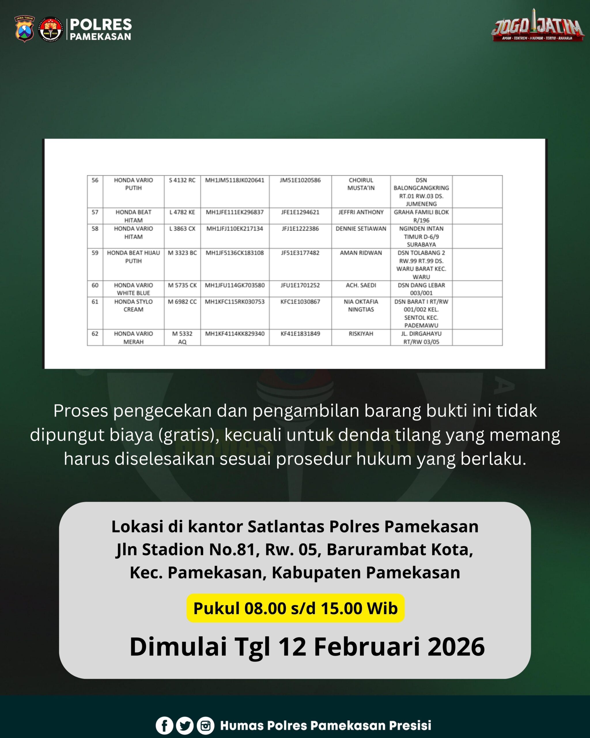Untuk memastikan kendaraan kembali ke tangan pemilik yang sah, silakan datang ke Kantor Satlantas Polres Pamekasan Pamekasan.