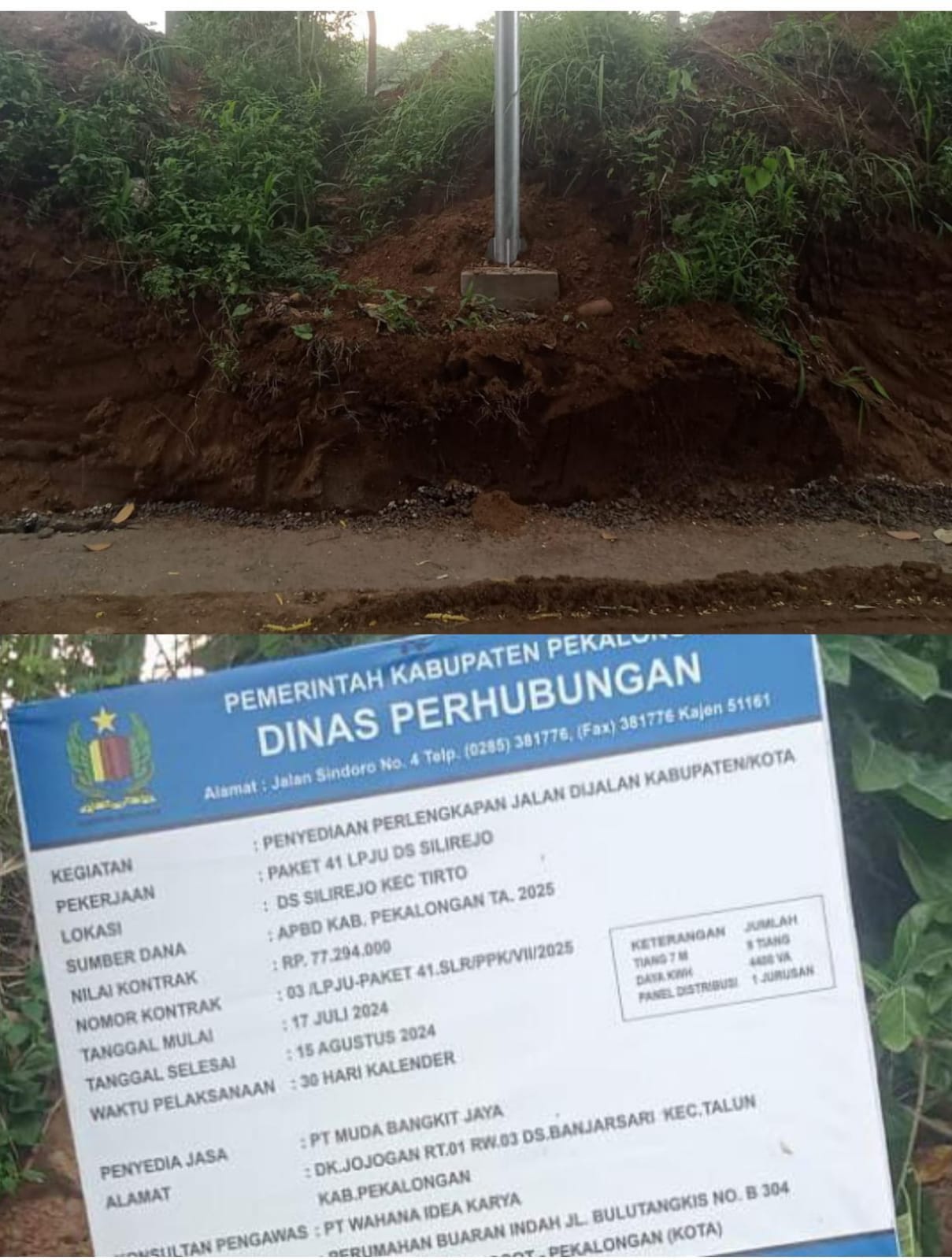Pemasangan 41 titik PJU di Desa Silirejo Kecamatan Tirto, kabupaten Pekalongan yang dilaksanakan oleh Dinas Perhubungan Kabupaten Pekalongan, diduga mengandung kejanggalan serta pembohongan publik terkait tanggal kontrak yang tercantum pada papan informasi proyek.