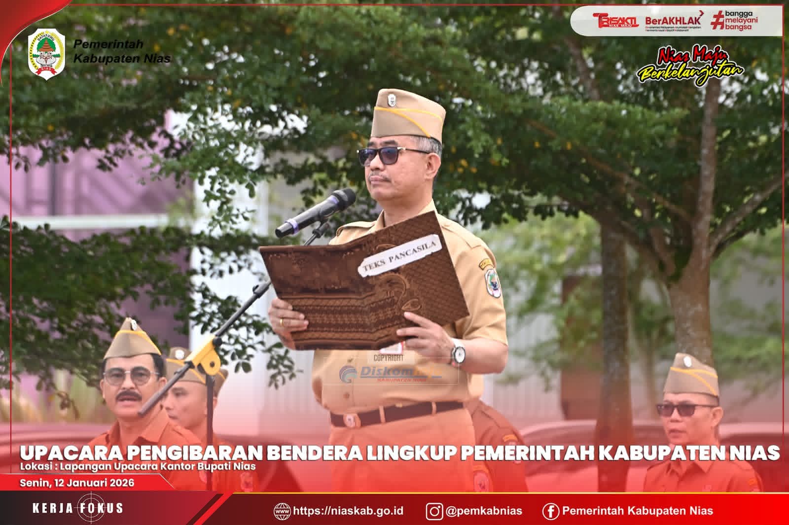 HAKSUARA.CO.ID / Nias / — Pemerintah Kabupaten Nias menggelar Upacara Pengibaran Bendera Merah Putih bertempat di Lapangan Upacara Kantor Bupati Nias. Upacara Pengibaran Bendera Merah Putih dipimpin oleh Sekretaris Daerah Kabupaten Nias, Samson P. Zai, S.H., M.H, dengan petugas upacara dari ASN BKPSDM Kabupaten Nias, serta diikuti oleh Staf Ahli Bupati, Asisten Sekda, Kepala Perangkat Daerah, Kepala Bagian, dan seluruh ASN Lingkup Pemkab Nias.senin, 12/01/2026