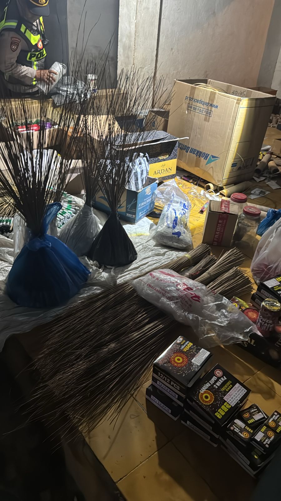 ”Saat melintasi lokasi, unit patroli mendengar suara ledakan petasan yang cukup keras. Petugas kemudian bergerak cepat menuju sumber suara di rumah saudara M. Di sana, anggota menemukan aktivitas pembuatan petasan dalam skala besar,” ujar IPDA Yoni Evan Pratama.