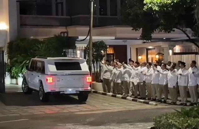 Mobil Prabowo sempat berhenti sesaat di depan barisan para kader, lalu langsung bergerak masuk ke halaman parkir di pekarangan rumah.