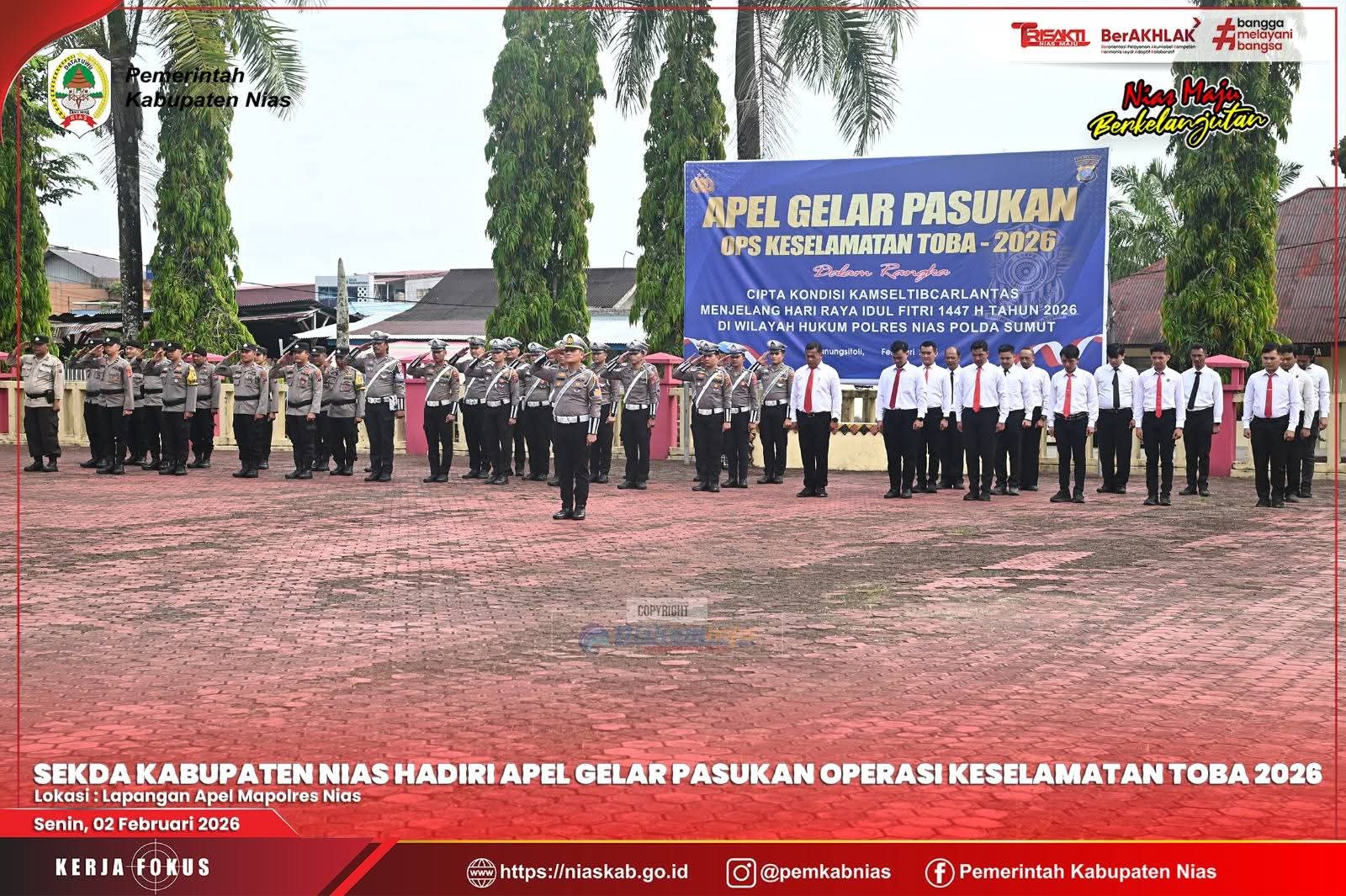 HAKSUARA.CO.ID / Nias / — Sekretaris Daerah Kabupaten Nias, Samson P. Zai, S.H., M.H, menghadiri Apel Gelar Pasukan Operasi Keselamatan Toba 2026 yang dilaksanakan Polres Nias Polda Sumatera Utara di Lapangan Apel Mapolres Nias.Senin, 02/02/2026